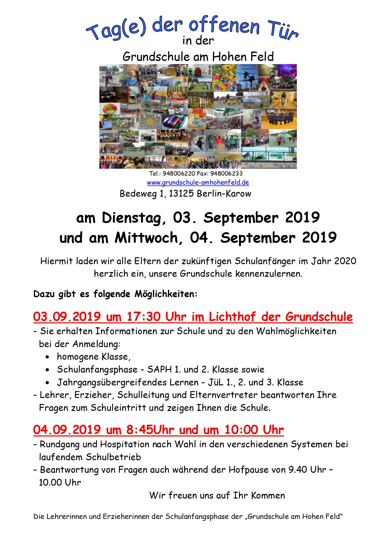 Herein spaziert! Hiermit laden wir die Eltern der zukünftigen Schulanfänger im Jahr 2018 am 21. September 2017 herzlich ein, am “Tag der offenen Tür” unsere