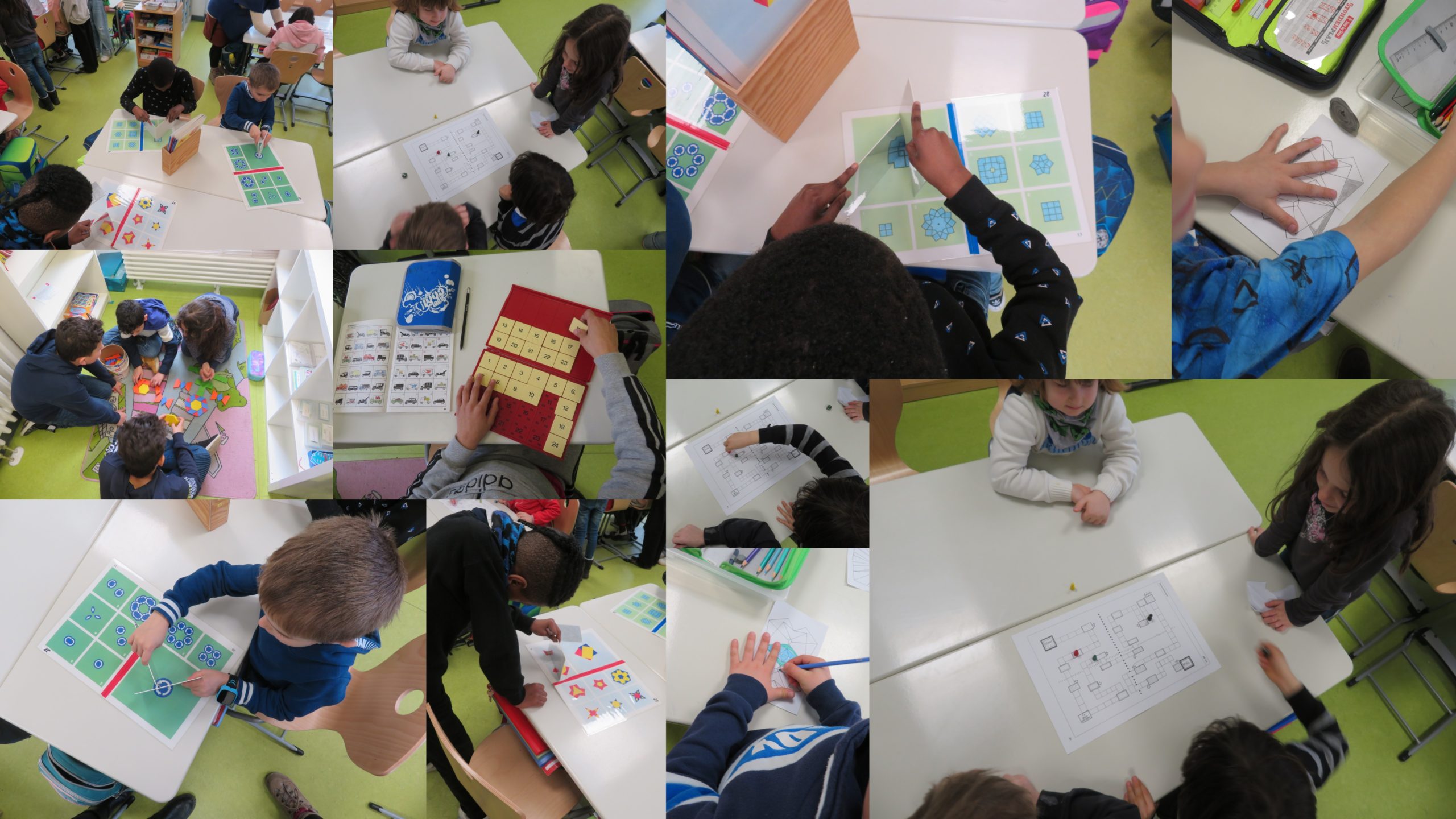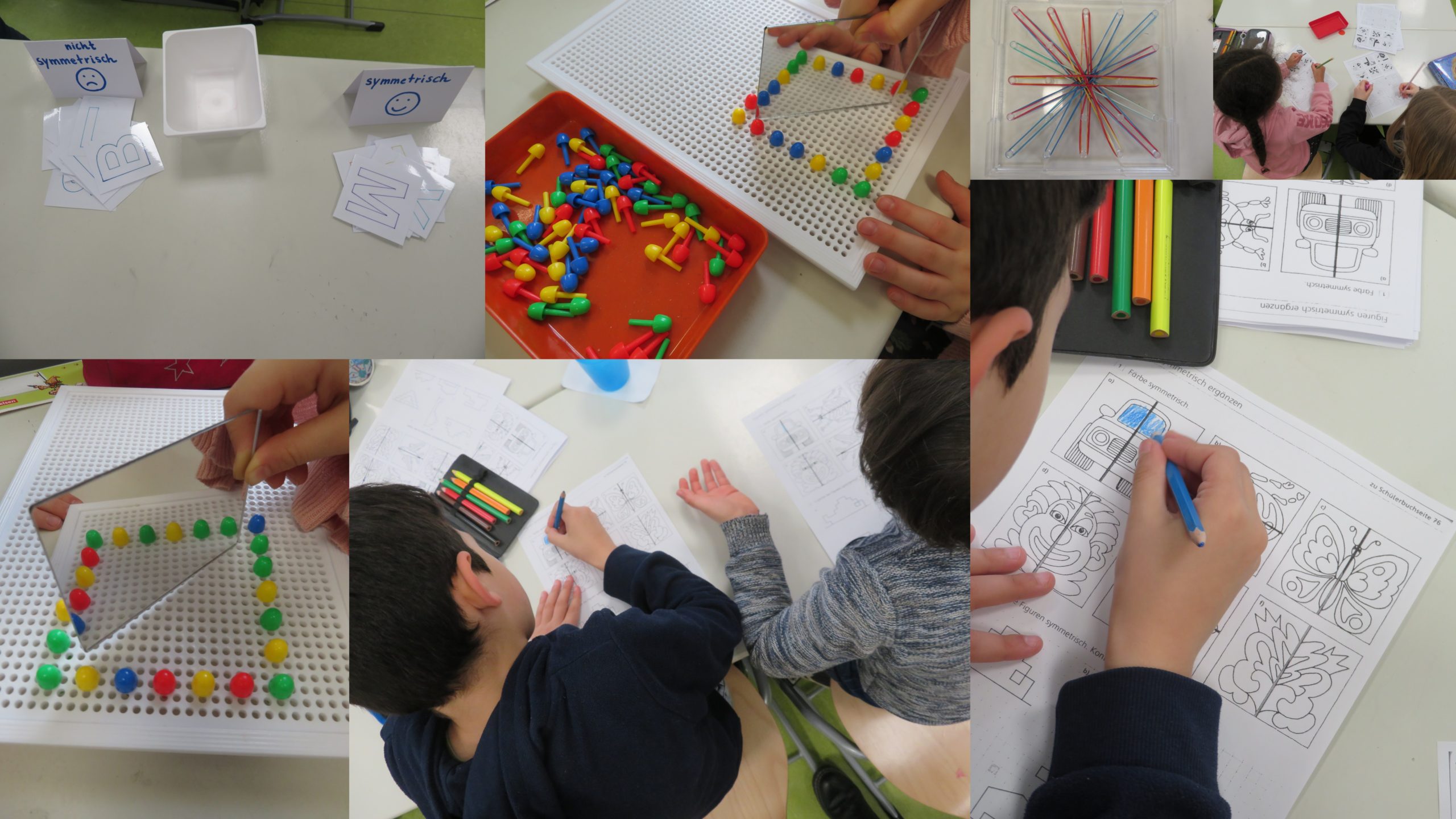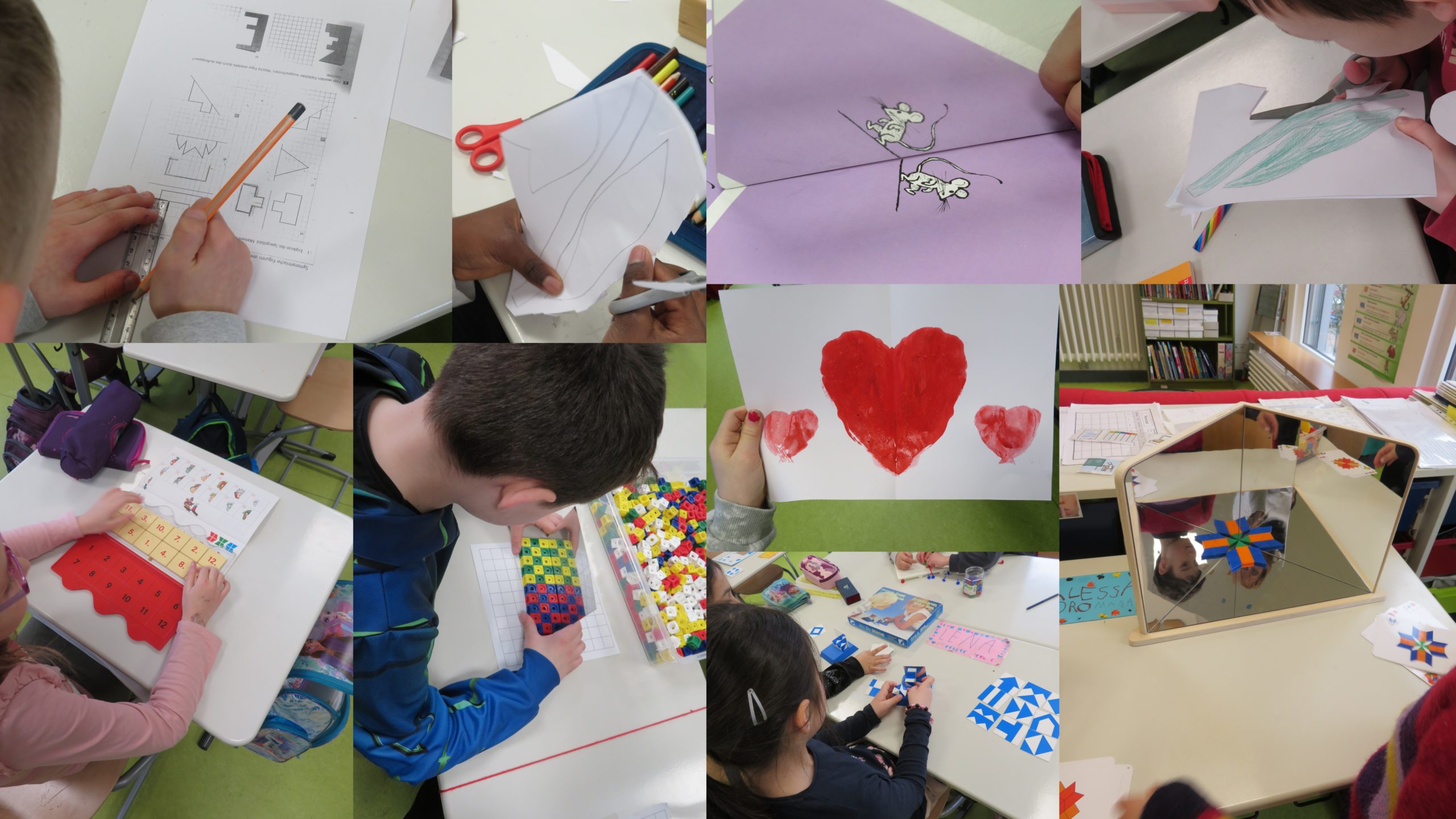 Wir öffneten für 4 Unterrichtsstunden alle Räume der JüL-Gruppen 1-3, so dass die Kinder verschiedenste Angebote der Symmetrie ausprobieren und erforschen konnten.
