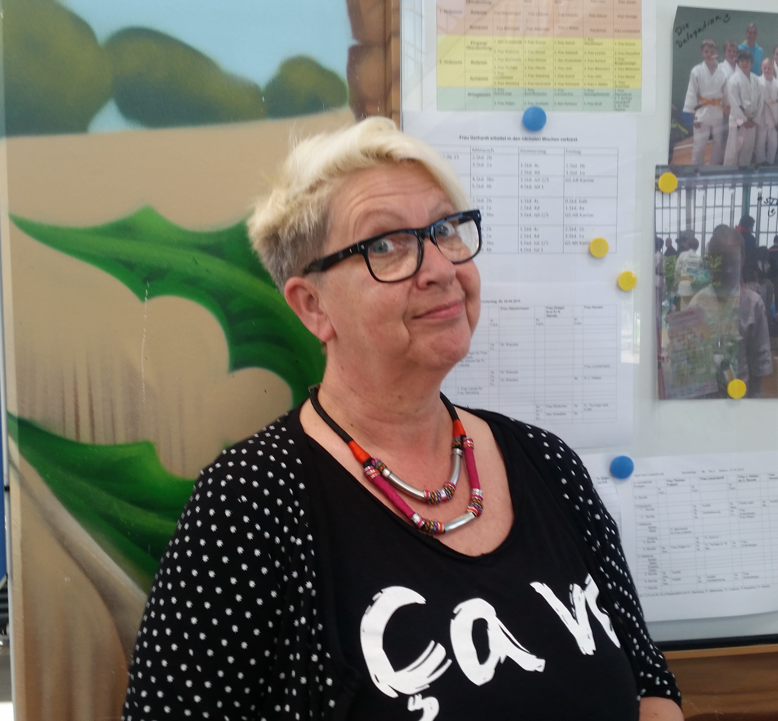 Unsere Schulsekretärin ist für viele verschiedene Aufgaben zuständig. Sie regelt den Besucherverkehr, vereinbart Termine für Lehrer und den Direktor, schreibt Briefe und verwaltet das Archiv der Zeugnisse und sonstigen Papiere, die mit dem Schulalltag zu tun haben.